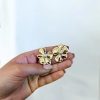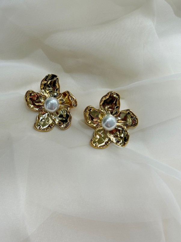 Χρυσό Ατσάλινο σκουλαρίκι σε σχήμα λουλουδιού και ακανόνιστα σφυρήλατα πέταλα που ενώνονται αρμονικά με μια κεντρική λευκή ολοστρόγγυλη περλιτσα. Το καρφακι τους βρίσκεται στην άκρη του κοσμήματος έτσι ώστε να κρέμεται σταθερά από τον λοβό.