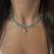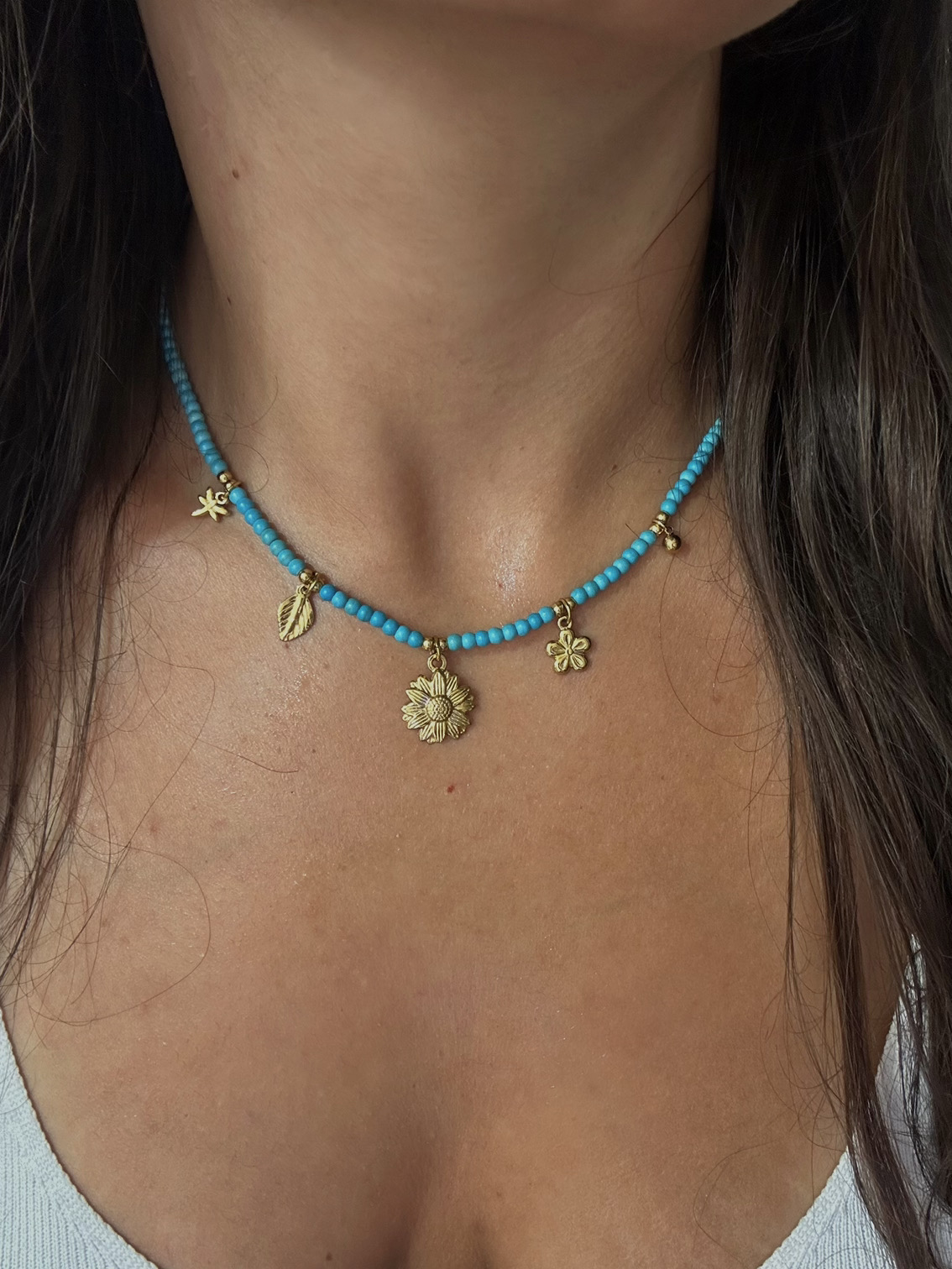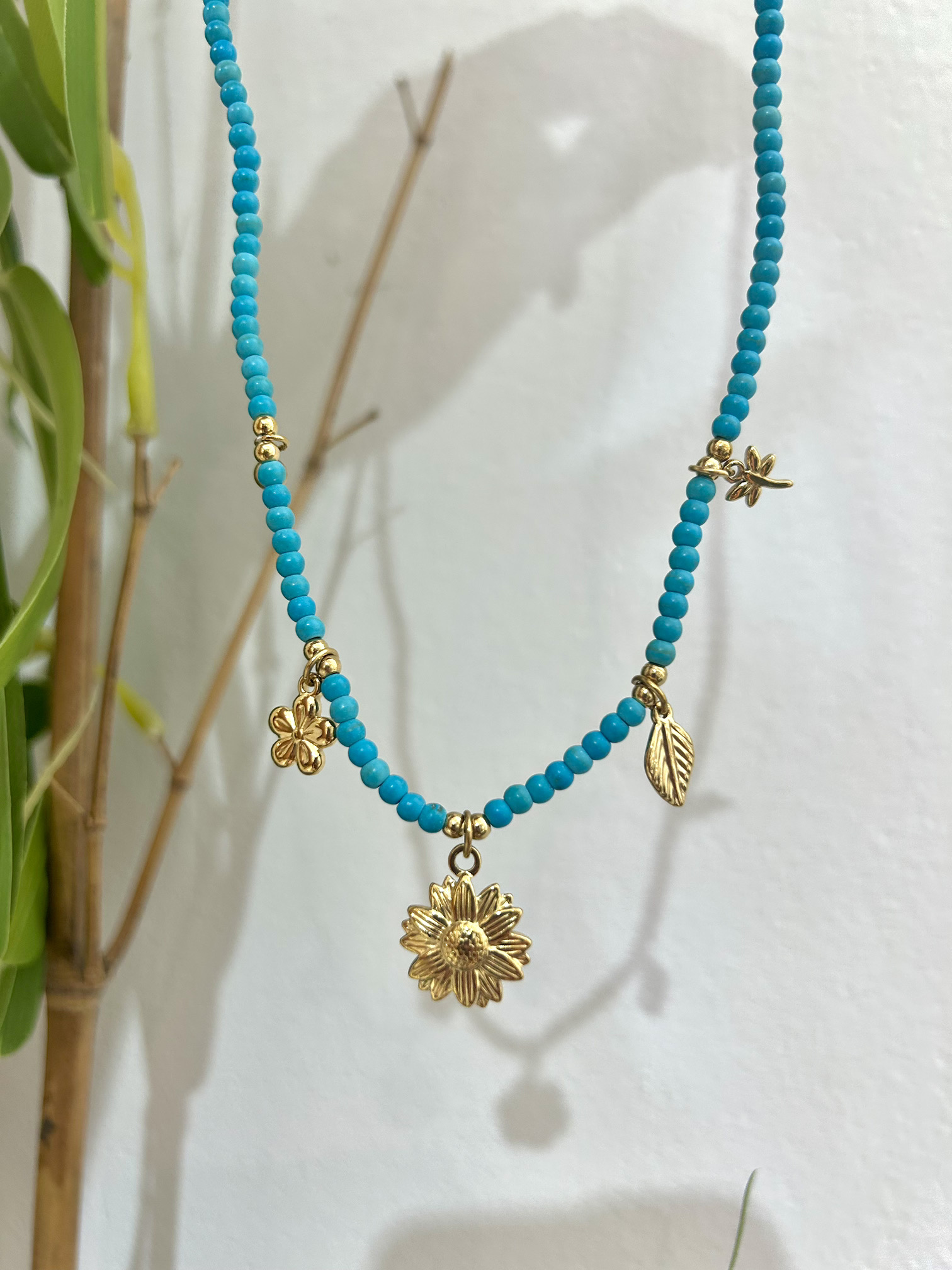 Κολιέ από ανοξείδωτο ατσάλι με μικρές τιρκουάζ χάντρες και χρυσά μεταλλικά στοιχεία. Στο κέντρο του υπάρχει ένα λουλούδι, πλαισιωμένο από charms με φύλλα, πεταλούδες και λιβελούλα. Φρέσκο και καλοκαιρινό, ιδανικό για καθημερινές εμφανίσεις.
