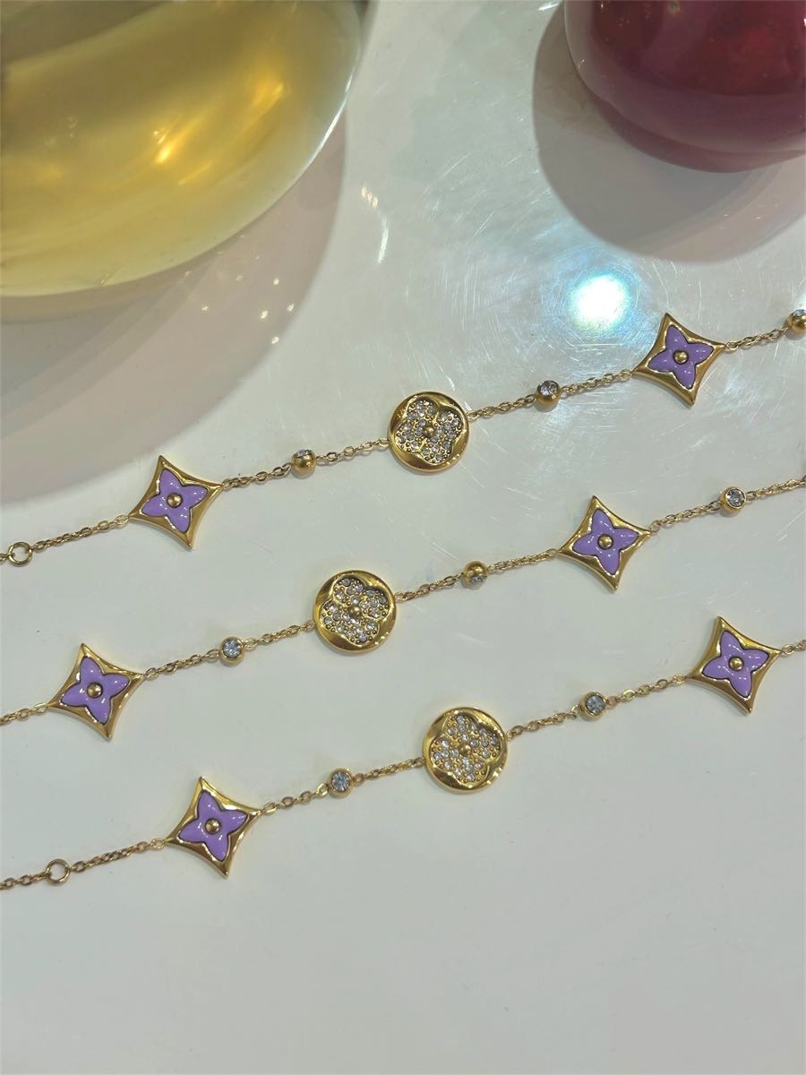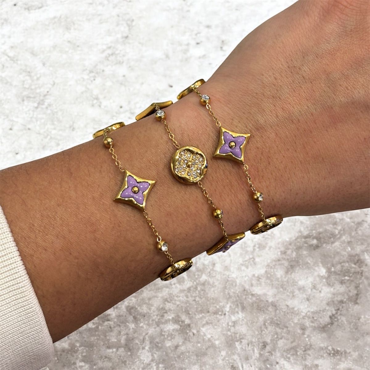 Εντυπωσιακό ατσάλινο βραχιόλι σε χρυσή απόχρωση, διακοσμημένο με μοτίβα λουλουδιού σε λιλά χρώμα και λαμπερές πέτρες που χαρίζουν διακριτική λάμψη. Ο συνδυασμός λεπτών αλυσίδων και διακοσμητικών στοιχείων δημιουργεί ένα κομψό και θηλυκό αποτέλεσμα. Κατασκευασμένο από ανοξείδωτο ατσάλι υψηλής ποιότητας. Φοριέται μόνο του ή σε συνδυασμό με άλλα βραχιόλια για πιο εντυπωσιακό layering.