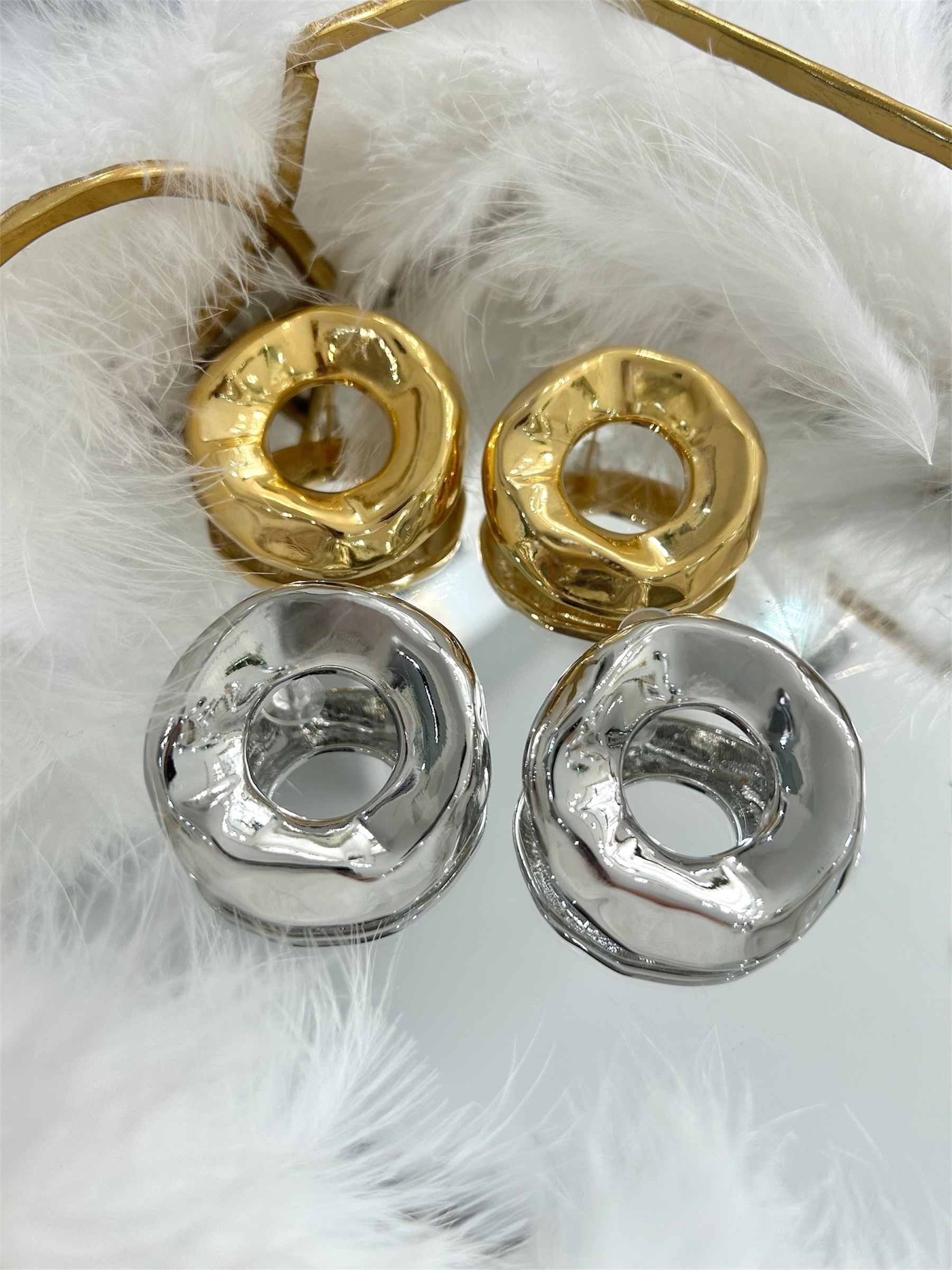 Χρυσά και ασημί μεταλλικά σκουλαρίκια από ανοξείδωτο ατσάλι, σε στρογγυλό σχήμα με εμφανές άνοιγμα στο κέντρο. Η επιφάνειά τους είναι γυαλιστερή και ακανόνιστη, θυμίζοντας λιωμένο μέταλλο. Το design είναι μοντέρνο και εντυπωσιακό, με ανάλαφρο, κυκλικό όγκο που ξεχωρίζει. Μήκοσ σκουλαρικιού 4 εκ.