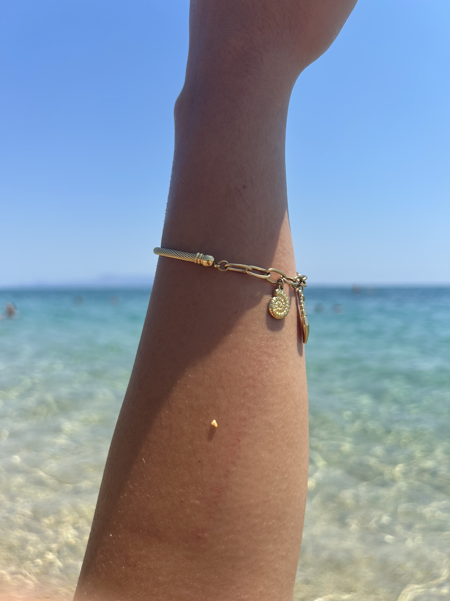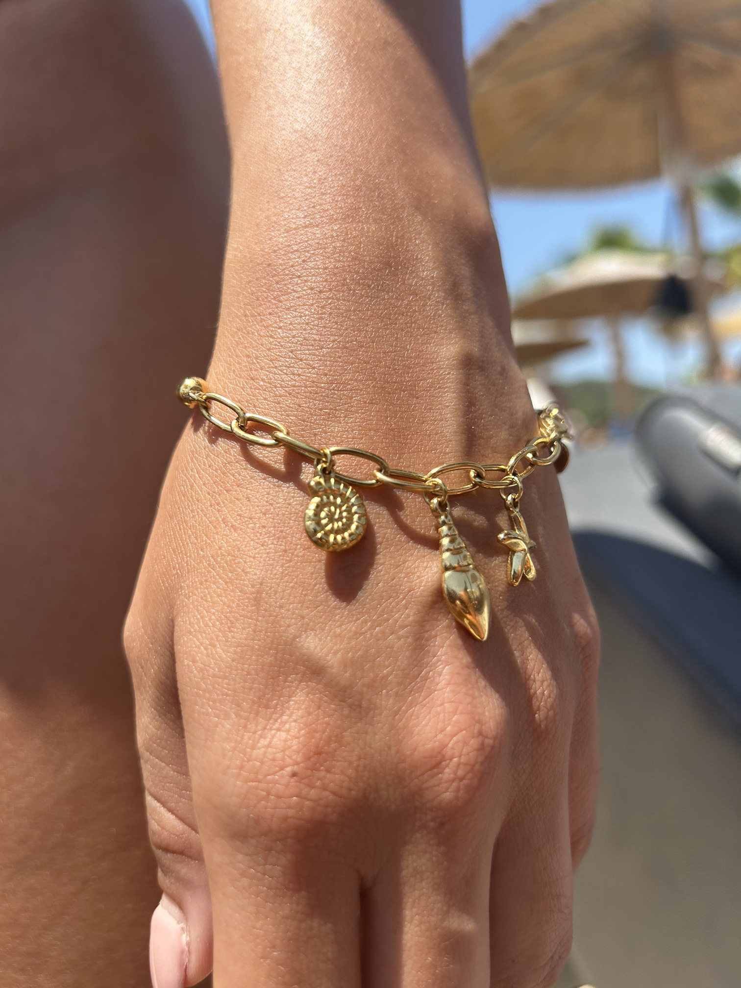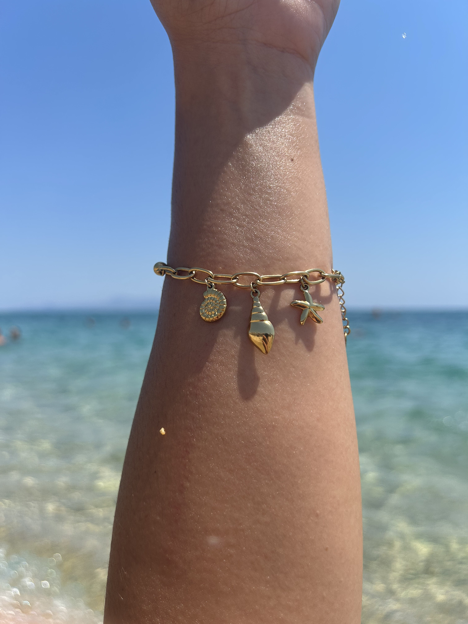Ατσάλινο βραχιόλι σε χρυσό χρώμα με συνδυασμό σταθερού μέρους και αλυσίδας. Το σταθερό τμήμα έχει στριφτό σχέδιο, ενώ καταλήγει σε αλυσίδα με τρία κρεμαστά charms: ένα κοχύλι, έναν αστερία και ένα ανάγλυφο όστρακο. Ιδανικό για καλοκαιρινές εμφανίσεις.