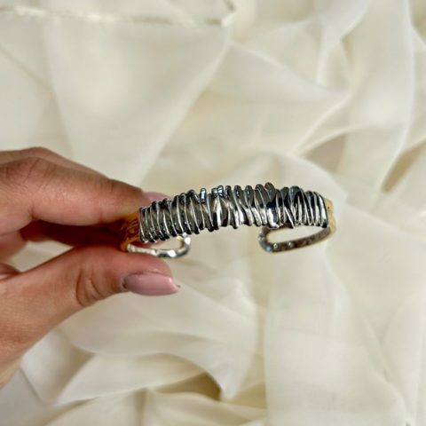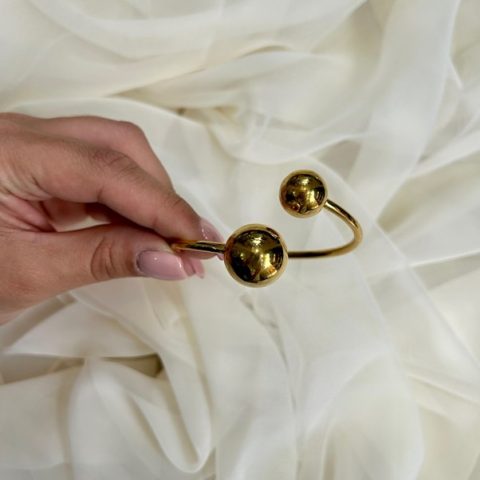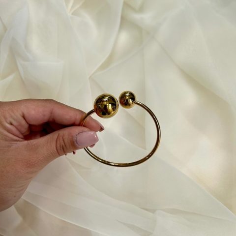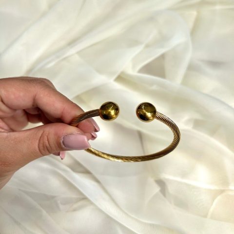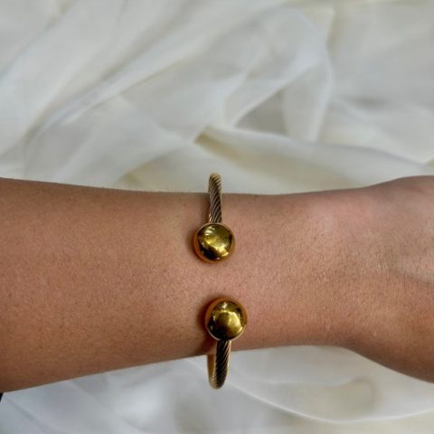 Ανοξείδωτο ατσάλι βραχιόλι σταθερό με ελαστική υφή με 2 μπίλιες στο τελείωμα. Είναι one size και φοριέται από το πλάι του καρπού χωρίς κούμπωμα. Έχει δυνατότητα προσαρμογής του μέγεθος του διότι είναι ελαστικό. διαμετρος 6 εκ .