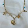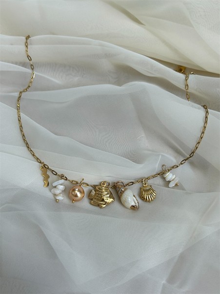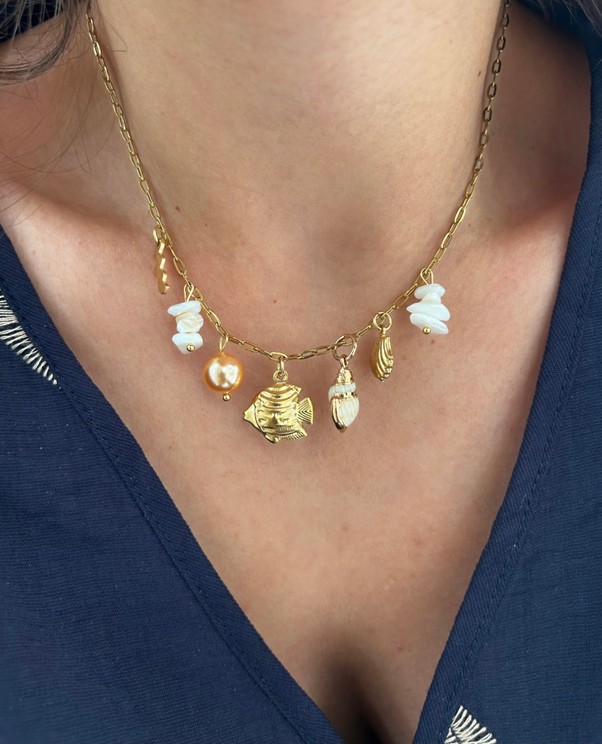 Προσθήκη στο καλάθιΧρυσό ατσάλινο κολιεδάκι με λεπτή αλυσίδα και καλοκαιρινά σύμβολα ψαράκι κοχύλια και χαντρούλες.
