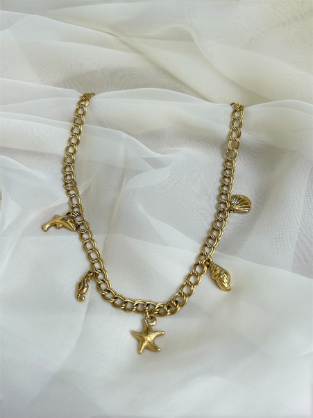 Χρυσό κολιέ ατσάλινο με χοντρή αλυσίδα και  καλοκαιρινά κρεμαστά σύμβολα charms.