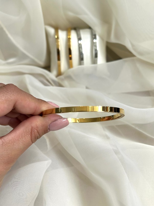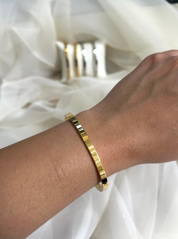 Χρυσή και  Ασημί  χειροπέδα από ανοξείδωτο ατσάλι, με τετραγωνισμένα τελειώματα και γεωμετρική αισθητική.  Η χειροπέδα διαθέτει διακριτικό σπαστό μηχανισμό. Για να την ανοίξετε, πιέστε ελαφρώς τη μία άκρη και ανασηκώστε την άλλη. Έπειτα τοποθετήστε την στον καρπό σας και επαναφέρετε τη θέση της μέχρι να ασφαλίσει.