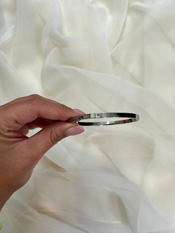 Xειροπέδα από ανοξείδωτο ατσάλι, με τετραγωνισμένα τελειώματα και γεωμετρική αισθητική.  Η χειροπέδα διαθέτει διακριτικό σπαστό μηχανισμό.