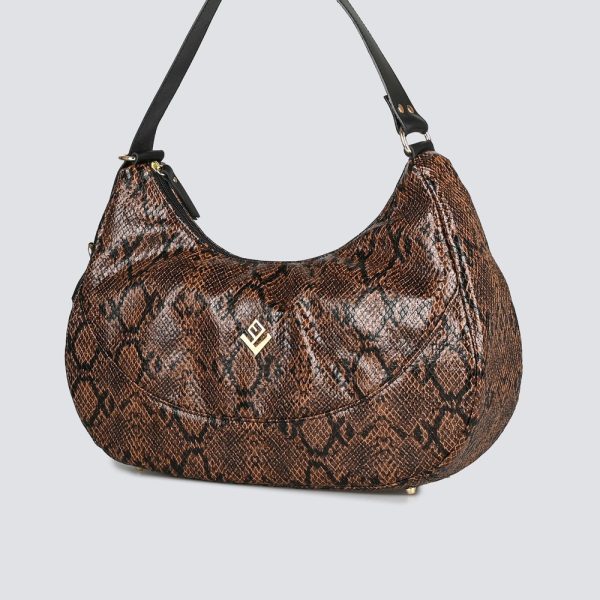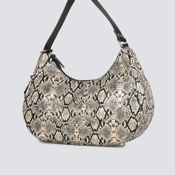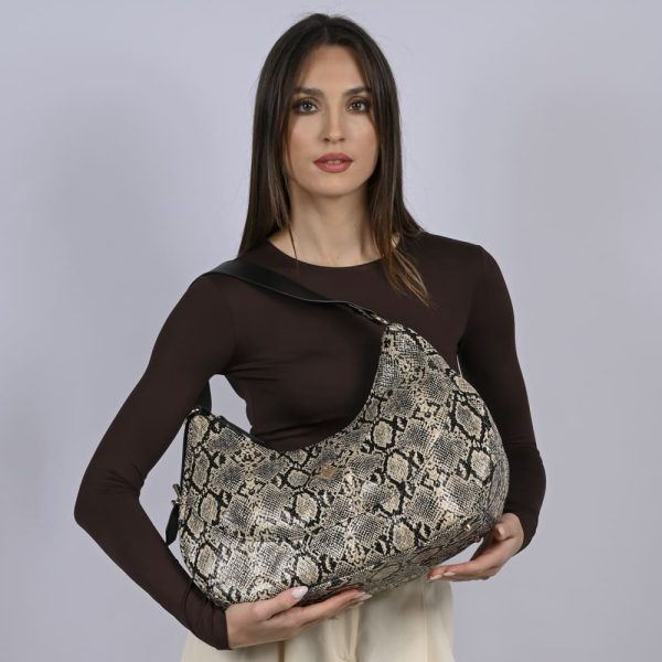 Η Demetra είναι ευρύχωρη τσάντα ώμου με snake print, δερμάτινες λεπτομέρειες και πρακτικό εσωτερικό — το απόλυτο statement της Feral Collection.