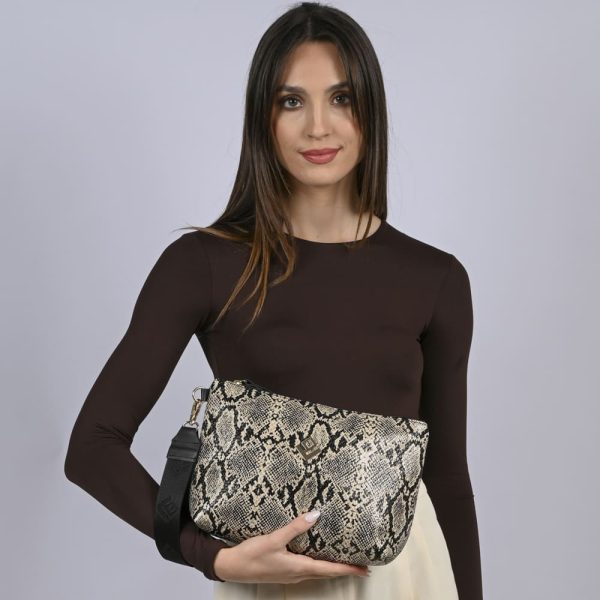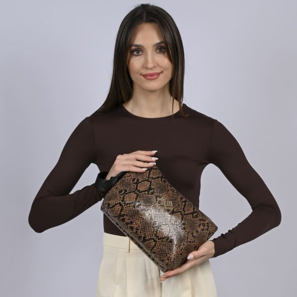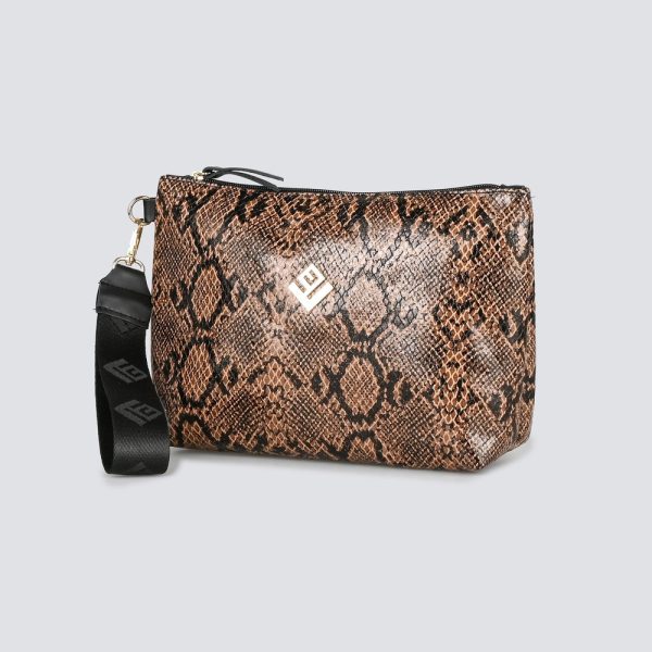 Το Classic Necessaire είναι διαχρονική, λιτή handbag από συνθετικό ανάγλυφο δέρμα με snake print. Διαθέτει εσωτερική τσέπη, ιμάντα καρπού με δερμάτινες λεπτομέρειες και κλείσιμο με φερμουάρ για ασφάλεια.