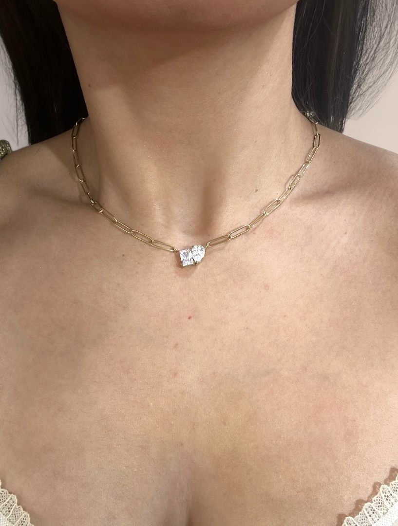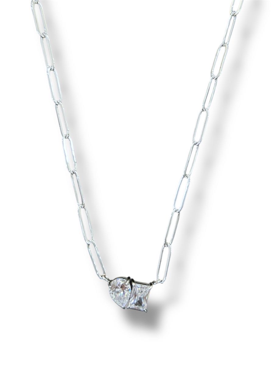 Κομψό κολιέ από ατσάλι, με διακριτική αλυσίδα σε σχέδιο οβάλ κρίκων , μία μεγάλη, τετράγωνη διάφανη πέτρα στο κέντρο σε συνδυασμό με μια πετρα σε σχήμα δάκρυ, που χαρίζουν έντονη λάμψη. Αναδεικνύει υπέροχα το ντεκολτέ, προσθέτοντας μία elegant πινελιά τόσο σε καθημερινές όσο και σε πιο βραδινές εμφανίσεις.