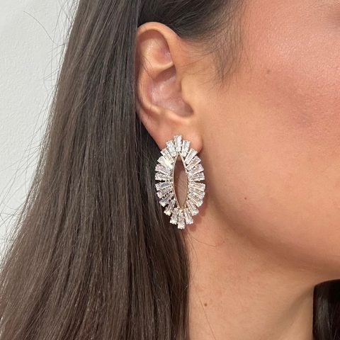 Λαμπερά σκουλαρίκια κρεμαστά από ορείχαλκο με στάλες ζιρκόν διαθέσιμα σε κίτρινα πορτοκαλί ροζ μοβ και γαλάζια. Το καρφάκι τους βρίσκεται στο επάνω μέρος του κοσμήματος ώστε να κρέμεται ελεύθερα με κίνηση.