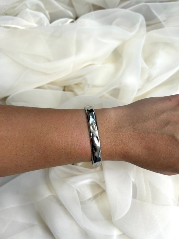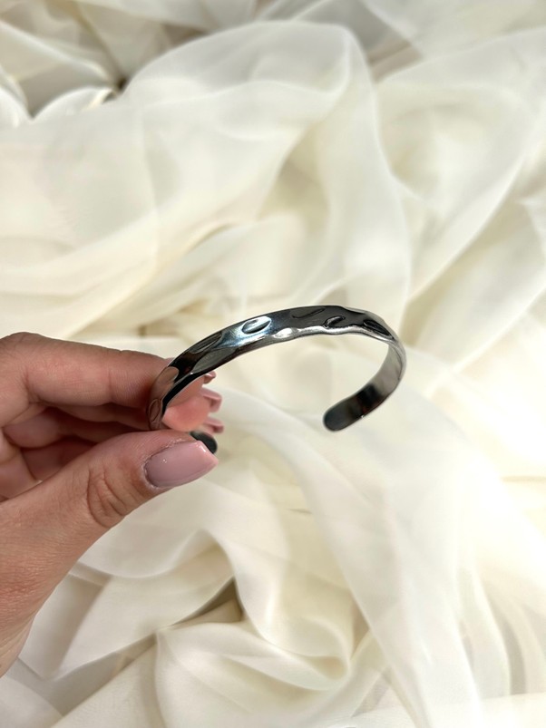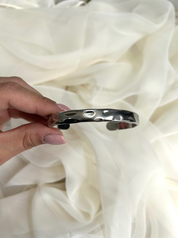 Ασημί σταθερή ανοιχτή χειροπεδα ατσάλινη, με απαλή σφυρηλατημένη υφή. Δεν διαθέτει κούμπωμα , φοριέται από το πλάι του καρπού. Το μέγεθος του μπορεί να προσαρμοστεί ελάχιστα εκατοστά.