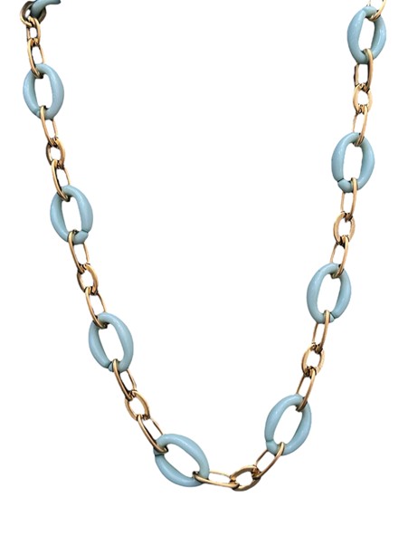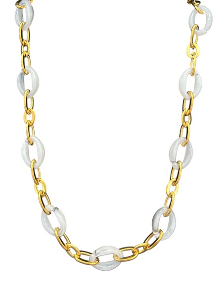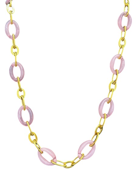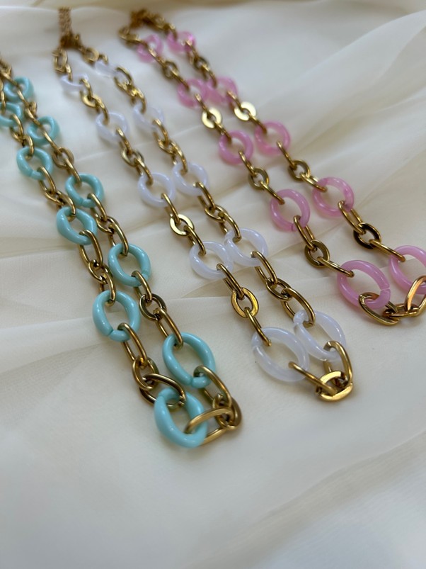 Ατσάλινα κολιέ σε χρυσό χρώμα με διάσπαρτα κοκάλινα χρωματιστά στοιχεία σε σχήμα οβάλ. Βγαίνουν σε τρία διαφορετικά χρώματα, ροζ , μπλε και λευκό.
