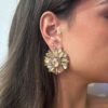 Αυτό το σκουλαρίκι έχει ξεκάθαρα floral αισθητική. Αποτελείται από μια σύνθεση επιμήκων, μακρόστενων κρυστάλλων τοποθετημένων ακτινωτά, σχηματίζοντας πέταλα λουλουδιού. Στο κέντρο υπάρχει μια μεγαλύτερη χρυσαφί–σαμπανί πέτρα που δίνει την αίσθηση άνθους. Η όλη δομή είναι ελαφρώς τρισδιάστατη, προσδίδοντας κίνηση και έντονη λάμψη.