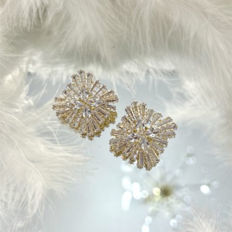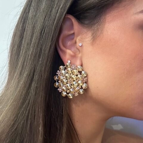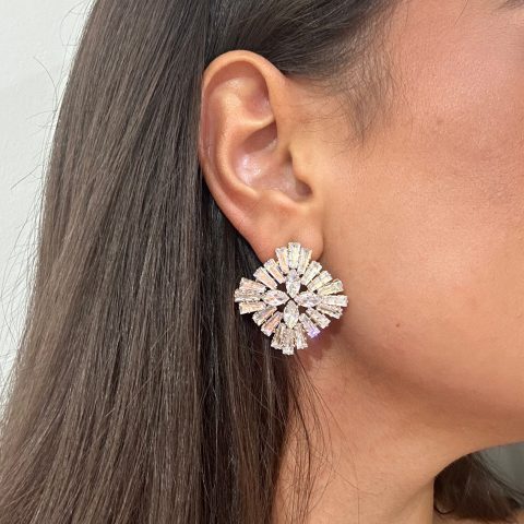 Εντυπωσιακό σκουλαρίκι απο χαλκό και ζιρκον, μήκους περίπου 4 εκ., σχεδιασμένο σε σχήμα διπλού “C” με καμπύλες γραμμές που αγκαλιάζουν το αυτί. Είναι πλήρως διακοσμημένο με αστραφτερά στρας, προσφέροντας πολυτελή λάμψη και κομψότητα. Ιδανικό για βραδινές εμφανίσεις ή για να δώσει glamorous χαρακτήρα σε κάθε outfit.