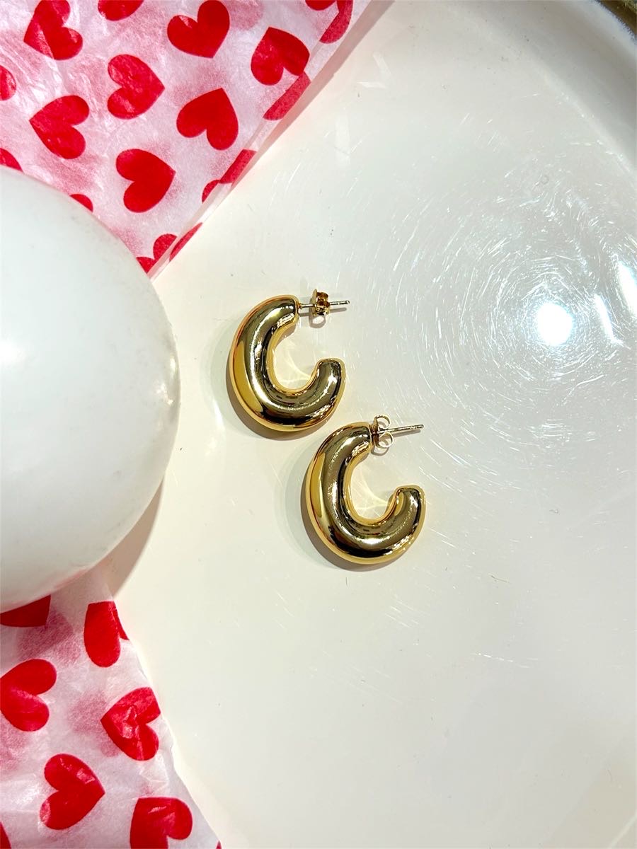 Σκουλαρίκια από ανοξείδωτο ατσάλι σε λείο, chunky σχήμα C με καθαρές καμπύλες και συμπαγή σχεδιασμό. Η απολύτως λεία και γυαλιστερή επιφάνειά τους προσφέρει έντονη λάμψη και minimal αισθητική. Κλείνουν με καρφάκι και εφαρμόζουν άνετα στο αυτί, αποτελώντας διαχρονική επιλογή για καθημερινά αλλά και πιο κομψά looks.