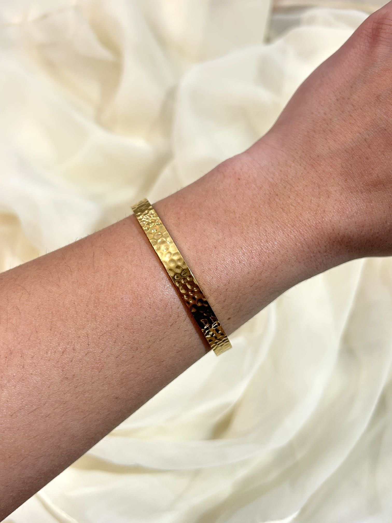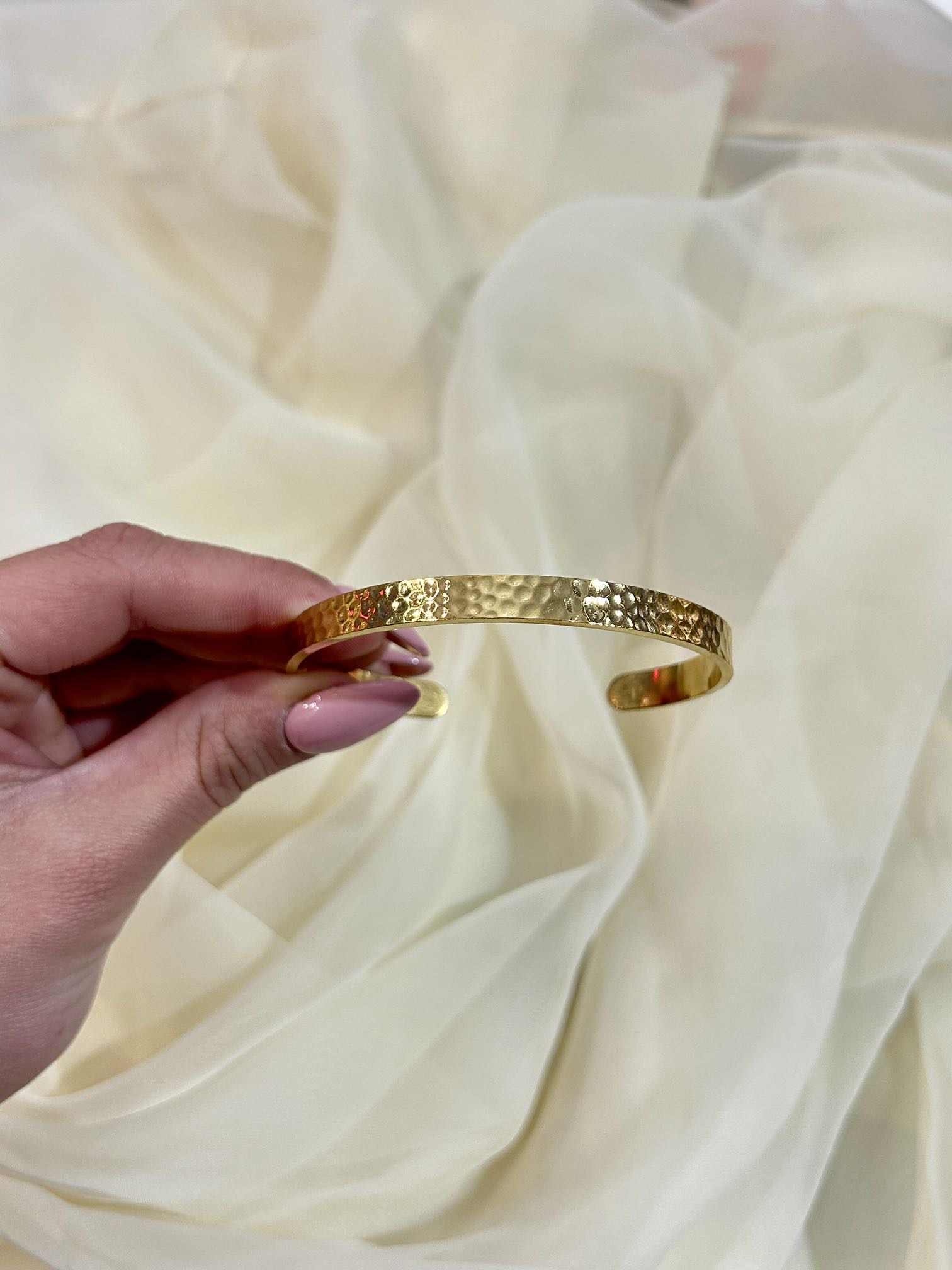 Βραχιόλι από ατσάλι , ξεχωρίζει για την ανάγλυφη, “σφυρήλατη” υφή του που δίνει έναν πιο edgy χαρακτήρα. Ένα μοντέρνο κομμάτι που προσθέτει ένταση και στυλ σε κάθε εμφάνιση. Είναι ανοιχτό και ελάχιστα ελαστικό ώστε να προσαρμόζεται τέλεια σε κάθε καρπό.