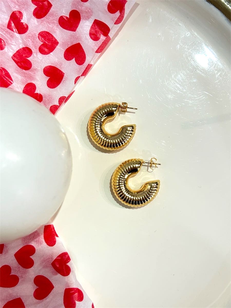 Σκουλαρίκια από ανοξείδωτο ατσάλι σε έντονο chunky σχήμα C. Η επιφάνειά τους αποτελείται από λεπτές, ομοιόμορφες ανάγλυφες ρίγες που αγκαλιάζουν την καμπύλη του κρίκου, δημιουργώντας βάθος και δυναμική υφή. Το γυαλιστερό χρυσό φινίρισμα αναδεικνύει τις γραμμές τους και προσθέτει ένταση στο σχέδιο. Κλείνουν με καρφάκι και εφαρμόζουν σταθερά στο αυτί. Ελαφρύ και κούφιο. Μήκος σκουλαρικιού : 3 εκ.