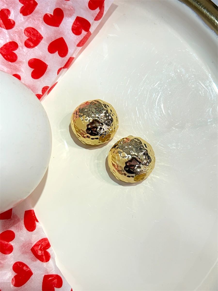 Σκουλαρίκια από ανοξείδωτο ατσάλι σε στρογγυλό, συμπαγές σχήμα τύπου button. Η επιφάνειά τους είναι σφυρήλατη και ανάγλυφη, δημιουργώντας ένα ανομοιόμορφο, “σπασμένο” εφέ που αντανακλά το φως από διαφορετικές γωνίες. Το γυαλιστερό χρυσό φινίρισμα αναδεικνύει τη δυναμική υφή τους. Κλείνουν με καρφάκι και εφαρμόζουν σταθερά στο αυτί, ιδανικά για statement καθημερινές εμφανίσεις. Ελαφριά και κούφια. Μήκος σκουλαρικιού : 3 εκ.