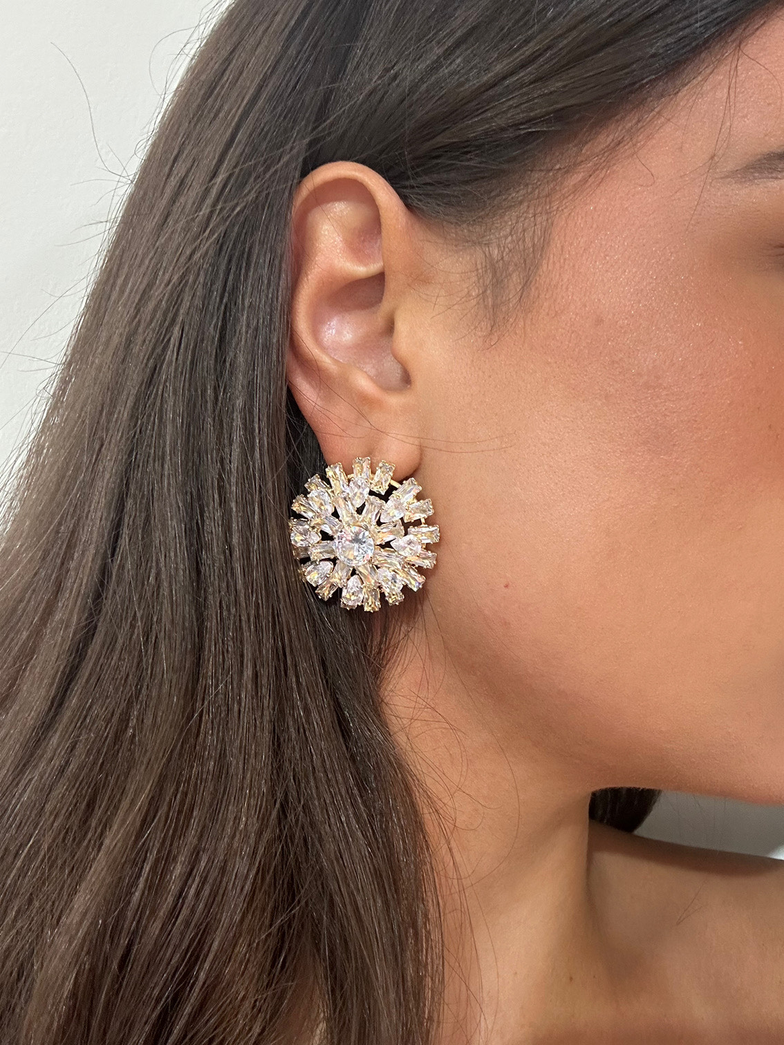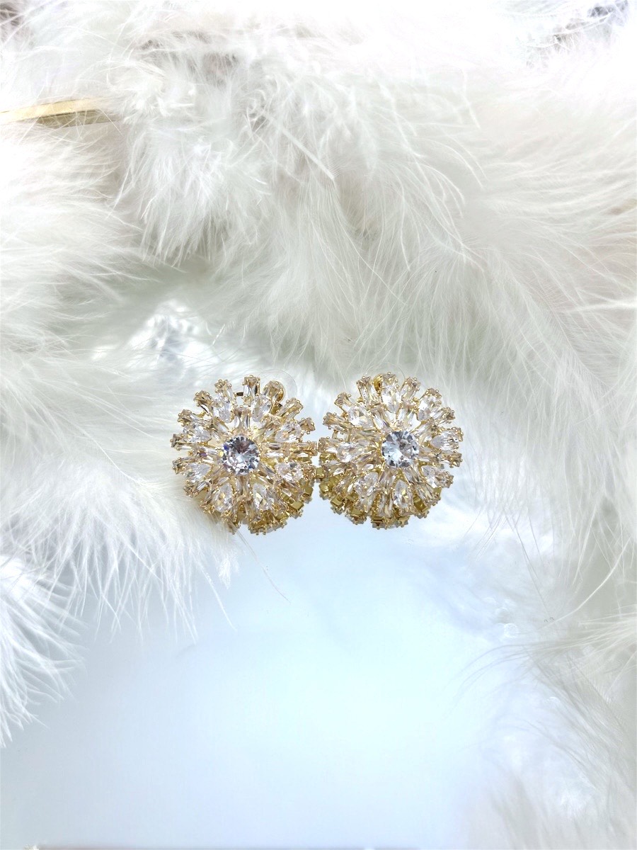 Statement σκουλαρίκι από ορείχαλκο με χρυσή βάση και λαμπερά ζιργκόν σε σχέδιο ροζέτας.