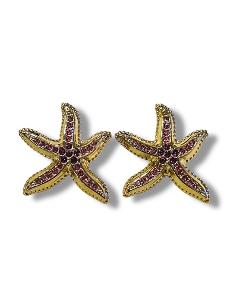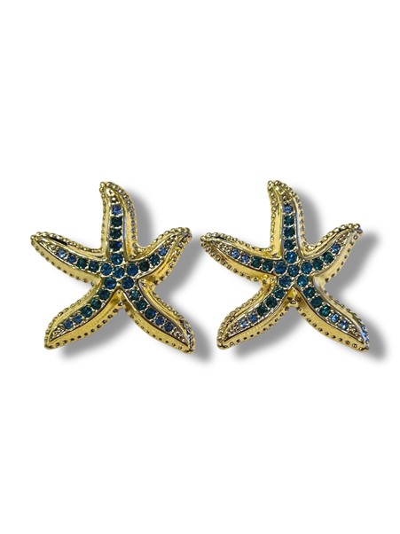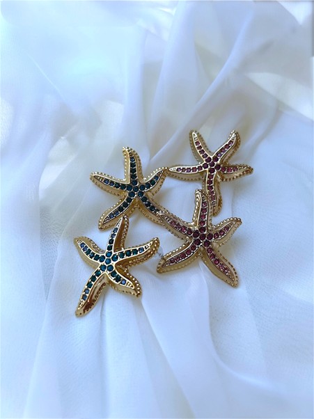 Σκουλαρίκι ατσάλινο σε σχήμα αστερία με εσωτερικά στρασακια και περιμετρικά στρογγυλές ανάγλυφες λεπτομέρειες . Βγαίνουν σε χρυσή βάση και ζιρκον σε αποχρώσεις ροζ και μπλε . Το καρφάκι τους βρίσκεται στο άνω μέρος του κοσμήματος και είναι σταθερό.