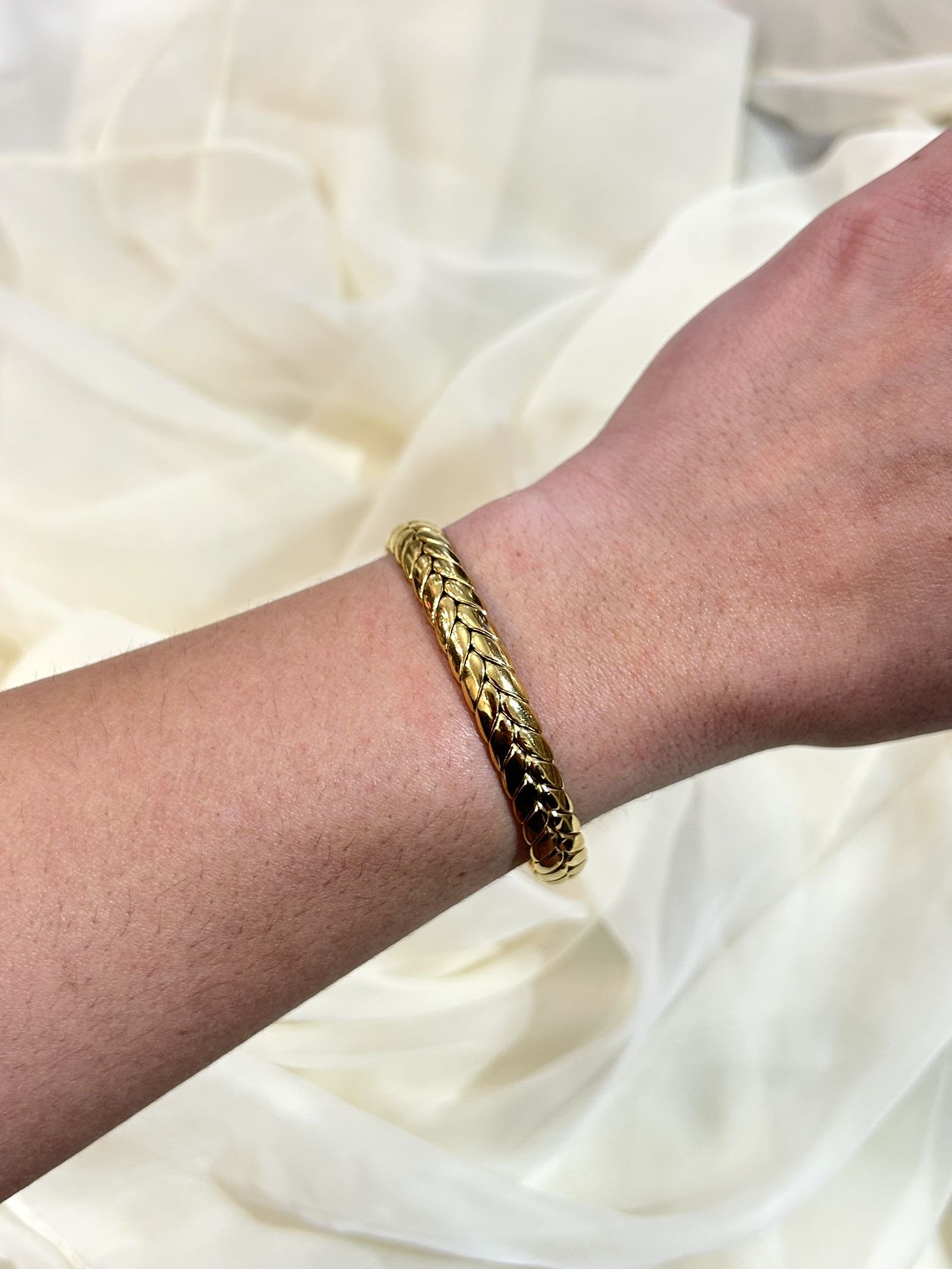 Υπέροχο βραχιόλι με πλεκτή λεπτομέρεια που αποπνέει κομψότητα. Κατασκευασμένο από ανοξείδωτο ατσάλι, αποτελεί ιδανική επιλογή για καθημερινή χρήση, ενώ ταυτόχρονα αναβαθμίζει κάθε outfit με διακριτική πολυτέλεια. Είναι ελάχιστα ελαστικό για να αγκαλιάζει τον κάθε καρπό τέλεια.