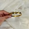 Χρυσό ατσάλινο ελαστικό βραχιόλι που απεικονίζονται ανάγλυφα τρισδιάστατα ανατολίτικα μοτίβα στην επιφάνεια του. διάμετρος βραχιολιού 6 εκ με δυνατότητα προσαρμογής λίγων εκατοστών.